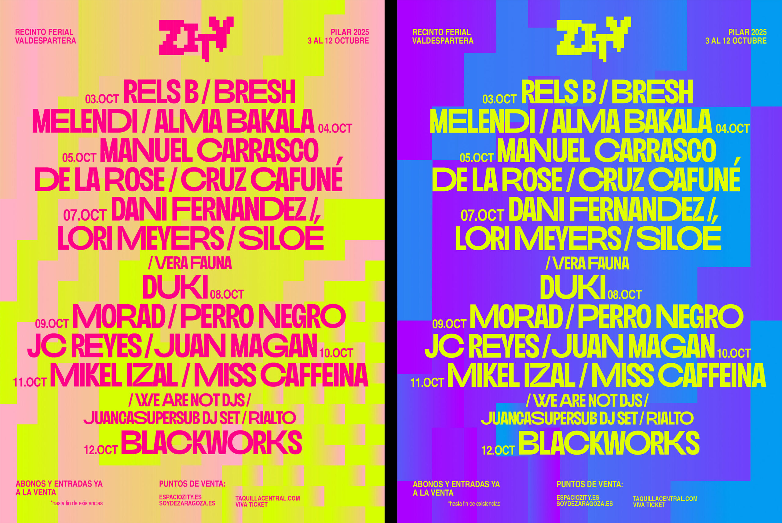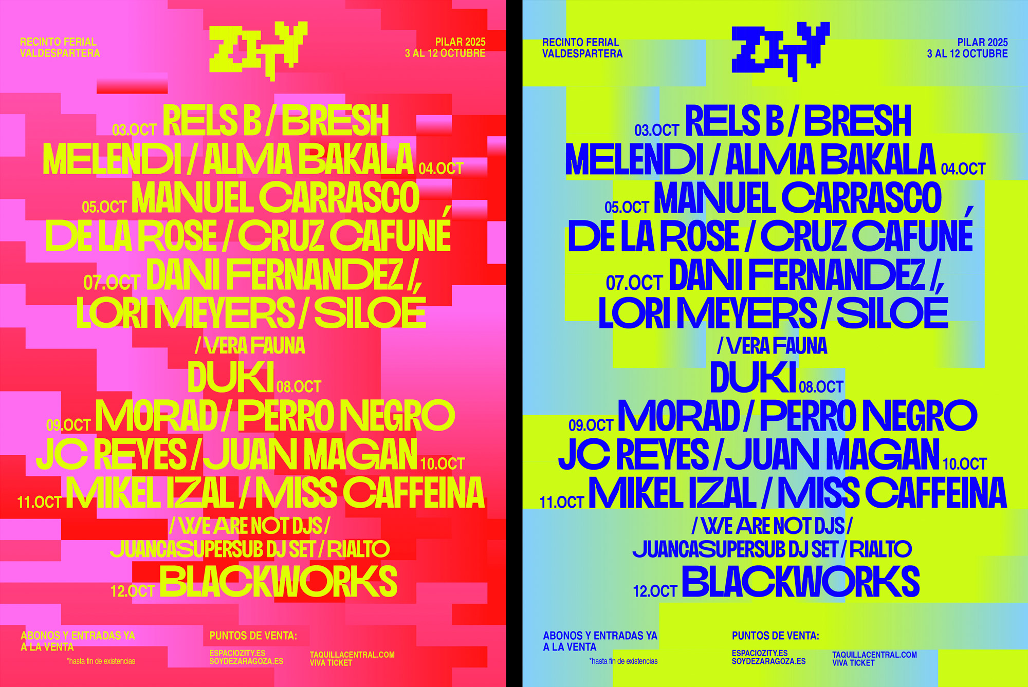 Identidad gráfica y campaña para Espacio Zity 2025, el principal recinto de conciertos de las Fiestas del Pilar de Zaragoza. Proyecto desarrollado en Siroko Studio haciendo equipo con El Señor Wom.